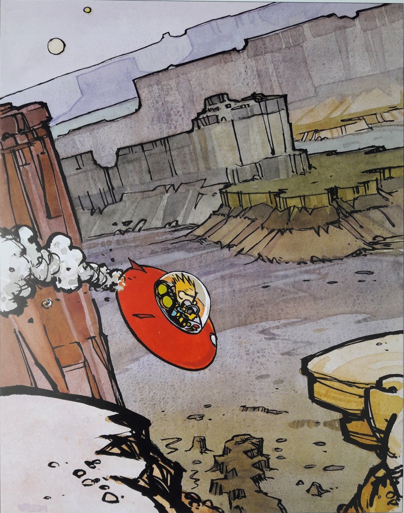 The red mountain scene was largely inspired by this wonderfully drawn panel from the comic. I exaggerated the ship’s destruction quite a bit so it reads better but kept the integrity of Spaceman Spiff and the ship’s design intact. I also took a lot of creative liberties in making the alien landscape, a humid world where hot water churns below and bursts through vast red rock mountains. The idea for water plumes that extend into the stratosphere was taken from by NASA’s Hubble discovery of possible water plumes on Jupiter’s moon, Europa.